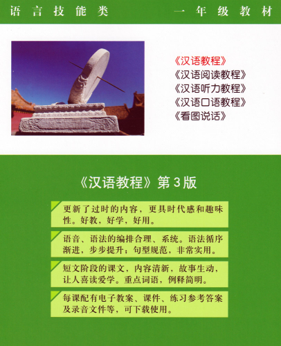 《汉语教程》是为来华留学的汉语学习者编写的一套综合汉语教材。包括6个分册,可供设有本科学历教育的教学单位使用一年。《汉语教程》是来华留学本科学历教育中使用最广泛、最有影响力的汉语教材之一。前两版累计销量已超200万册。