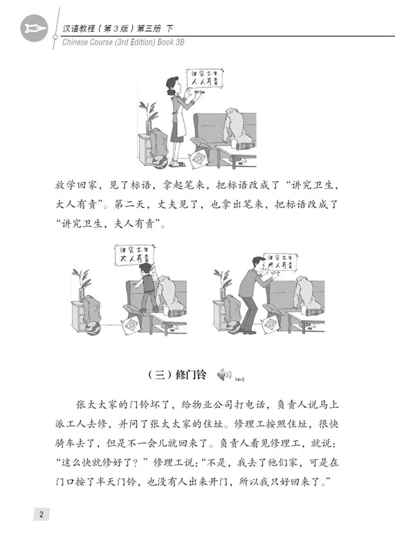 本书是第3版第三册下,共13课。衔接第三册上,进入词汇短文教学阶段。每课的体例大致为课文、生词、注释、词语用法、练习等。课文以记叙文为主,承担听说读写四项言语技能训练任务;每课生词量继续扩大;词语用法重点讲解词语的用法和近义词语用法对比;练习设计题型丰富,包含了理解性、模仿性和交际性练习等。