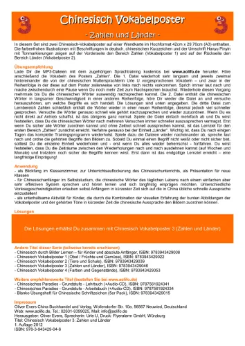 In diesem Set sind zwei Chinesisch-Vokabelposter auf einer Wandkarte im Hochformat 42cm x 29,70cm (A3) enthalten. Die farbenfrohen Illustrationen mit Beschriftungen in deutsch, chinesischen Kurzzeichen und der Umschrift Hanyu Pinyin mit Tonmarkierungen zeigen auf der Vorderseite (Vokabelposter 1) Zahlen, die durch die Anzahl von Personen, Tieren oder Gegenständen symbolisiert werden (z. B. drei Bleistifte für die Zahl 3, vier Pandas für die Zahl 4) und auf der Rückseite bekannte Länder, die durch ihre Flaggen dargestellt werden (Vokabelposter 2). Durch die effektive Kombination der Vokabelposter mit dem Sprachtraining (kostenloser Download des Sprachtrainings unten) fällt es leicht alltägliche chinesische Wörter ganz einfach und scheinbar mühelos sprechen und hören zu lernen und sich dauerhaft einzuprägen. Das Sprachtraining wiederholt die Begriffe der Vokabelposter in unterschiedlicher Reihenfolge und Geschwindigkeit. Mit zunächst sehr langsamen Geschwindigkeit und streng nach Reihenfolge beginnend, schafft man es als Anfänger sich die Begriffe problemlos einzugrägen. Anschließend hört man die Begriffe in einer komplett anderen Reihenfolge - zunächst langsam und schließlich schnell. Durch die allmähliche Steigerung der Geschwindigkeit und die ständige Wiederholung der Begriffe schafft man es sich die Begriffe dauerhaft einzuprägen, diese bei Bedarf aus dem Gedächtnis aufzurufen und sogar bei Gesprächen herauszuhören. Eine intensive Lernerfahrung, die nicht nur Spaß macht, sondern auch schnell ein Erfolgserlebnis hervorbringt! Mit beiliegender Übungsanleitung.