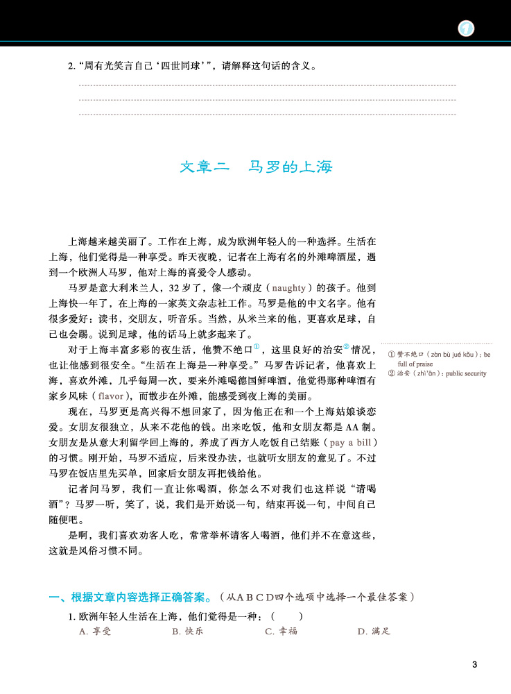 This textbook includes altogether 15 lessons, each with 5 passages, except for the review lessons Lesson 8 and Lesson 15, each of which has 7 passages. Developed on the basis of the first edition, this book, taking learners’ reading habits into consideration, has each of its lessons divided into four styles of reading, i.e. reading in detail, reading through, skimming through and scanning, to train the learners’ reading skills. The passages are authentic language data taken from newspapers, magazines or the Internet. The content is up-to-date and practical and the exercises are designed diversely. Having finished this book, the learners may find their ability of reading articles of various writing styles and language registers quickly improved and meanwhile have a close look at the real and vigorous modern China.