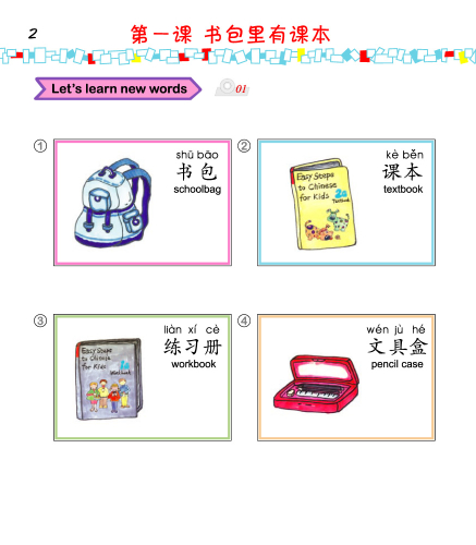 本册为课本3b,图片精美,四色印刷。共7课,包括文具、学校设施、方位、爱好、饮食、自然等内容。本册继续学习声母和复韵母,每课学习2个独体字,并设计了更多的汉字书写、组句、简单语篇表达等内容,还有专项听力题,让学生进一步提高汉语听说读写综合能力。