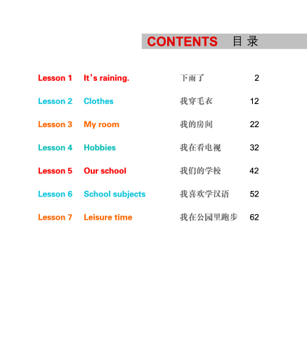 本套教材围绕丁一、田力、京京和乐乐4个中外小学生的故事展开,用精美的插图、简短的句子和对话、优美的歌曲等生动的形式培养起学生学习汉语的兴趣,使其轻松打好汉语学习的基础,掌握如数字、汉字基本笔画、家庭成员、日常用语等汉语知识,并且每册以精美的图片、简洁的文字和有趣的彩色贴纸等形式介绍一个中国文化小知识。
