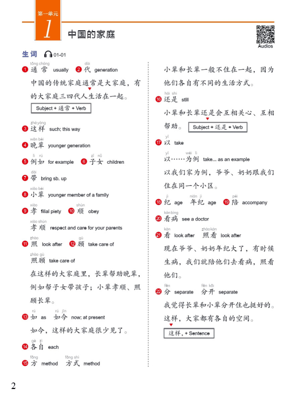 本套教材旨在为学生奠定扎实的汉语基础,帮助学生在现实生活中得体、准确地使用语言, 有逻辑、有条理地表达观点和思想。这个目标是通过语言、主题和文化的自然结合,字、词、句、语法等语言知识的学习以及听、说、读、写各项交际技能的训练来实现的。
