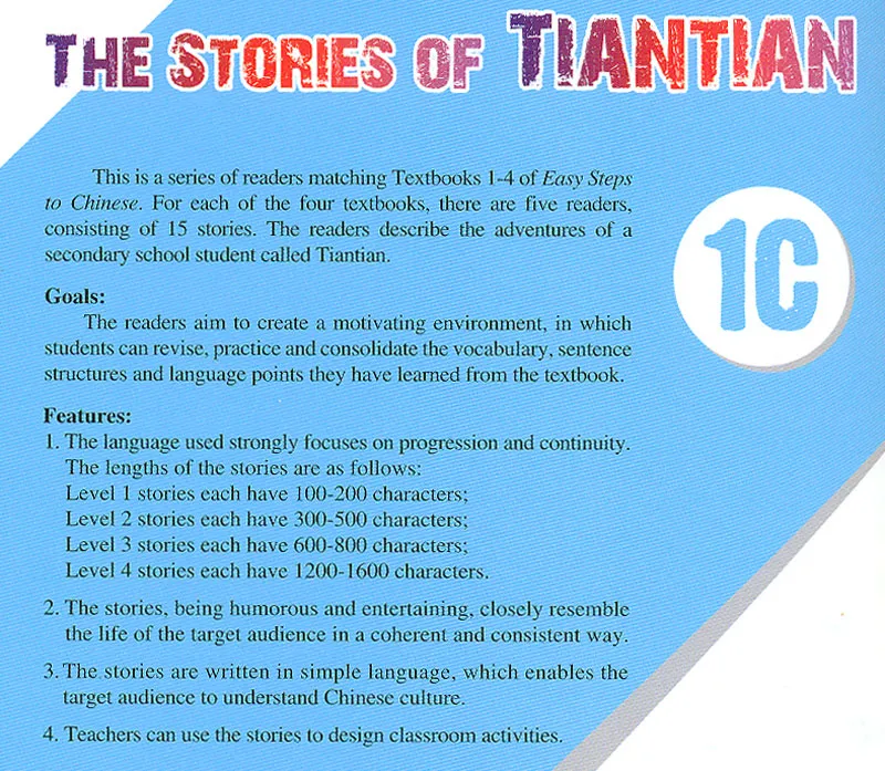 The Stories of Tiantian is a series of readers matching Textbooks 1-4 of Easy Steps to Chinese. For each of the four levels, there are five readers, each telling three stories, matching the three lessons in each unit of Easy Steps to Chinese. The readers describe the adventures of a student called Tiantian. The readers aim to create a motivating environment, in which students can revise, practice and consolidate the vocabulary, sentence structures and language points they have learned from the textbook.