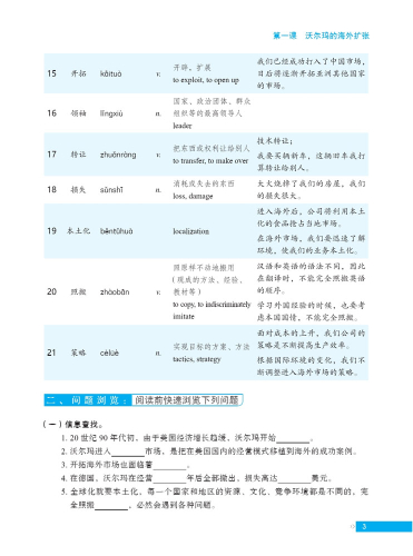 本教材可与“尔雅中文”其他系列教程配套使用,也可为开设经贸汉语阅读课的学校单独使用。教材内的“课文”“拓展阅读”“附录”几个板块相对独立,几个板块内部的各部分也是相对独立的,难易度也有一定的匹配,教师可根据自己的课程设置情况和学习者的情况自主取舍,灵活选用。附录部分也可以供学有余力的学习者作为课外阅读使用。教材适合在正规高等院校学过一年汉语或具有同等汉语水平的、具有初级汉语基础的商务汉语学习者。建议每周2 ~ 4学时的经贸汉语阅读课使用。