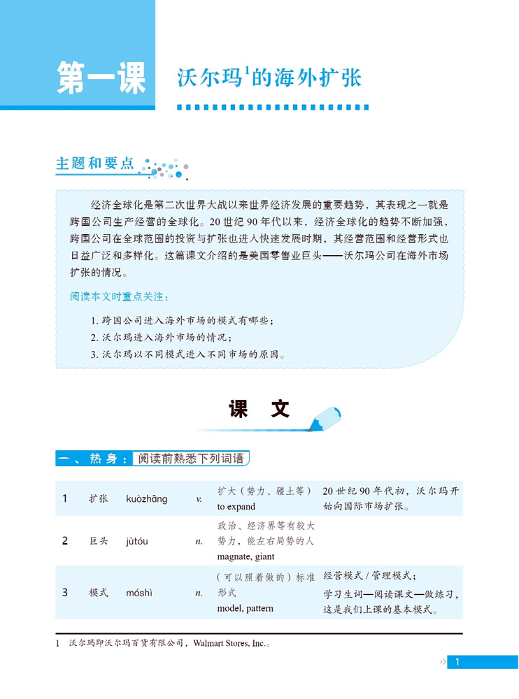 本教材充分考虑经贸汉语入门阶段的教学特点,以经贸汉语知识、阅读技能训练为核心,经贸专业知识尽量融合在“课文”与“拓展阅读”之中,三条主线相辅相成,重视经贸词汇,选取经典话题,使学习者在学习典型词汇、理解经贸知识的同时,养成科学视角,全面提升阅读能力和语言技能。