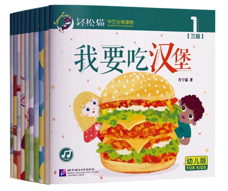 Chinesische Kleinkinder lernen durch Bilder leichte Sätze zu sprechen, jeder Band dieser Reihe Smart Cat for Kids (spricht gegenüber der Reihe Smart Cat noch kleinere Kinder an) enthält einige leichte Sätze in Schriftzeichen und Pinyin. Die Bilder animieren den Sinn besser zu verstehen. Durch Scannen des QR-Codes auf der Buchrückseite mit seinem mobilen Gerät kommt man zum Bereich wo man die Sätze im Buch sich anhören kann.
