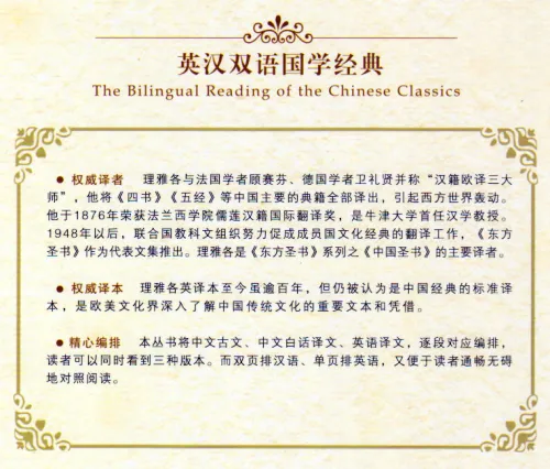 Diese Hardcover Ausgabe enthält parallel den chinesischen Text jeweils links und die englische Übersetzung auf den gegenüberliegenden Seiten. Der chinesische Teil enthält den Originaltext, die modernchinesische Übersetzung sowie eine Analyse. Der englische Teil verfügt ausschließlich über die Übersetzung.