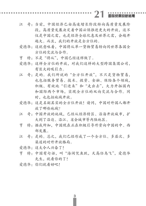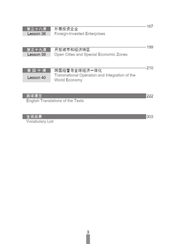 The book covers all aspects concerning foreigners' business activities in China, such as establishing contact, signing contracts, credit risks and management, online transaction, three kinds of enterprises with foreign investment, township enterprise, the reform and opening up policy, etc. It has included the new situations, topics and expressions in contemporary China's foreign economy and trade. After finishing the Intermediate volume, students will get to know 40 topics in Chinese economy and the related terms.