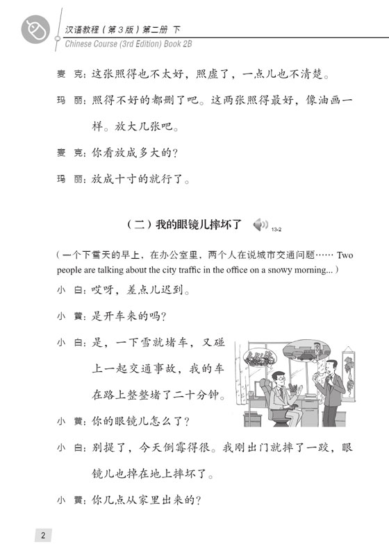 本书是第3版第二册下,共13课。衔接第二册上,继续语法句型教学阶段。每课的体例大致为课文、生词、注释、语音/语法、练习等。课文以实用会话为主,是语法和词语的语用场;生词均为基本常用词;练习设计题型丰富,包含了理解性、模仿性和交际性练习等。