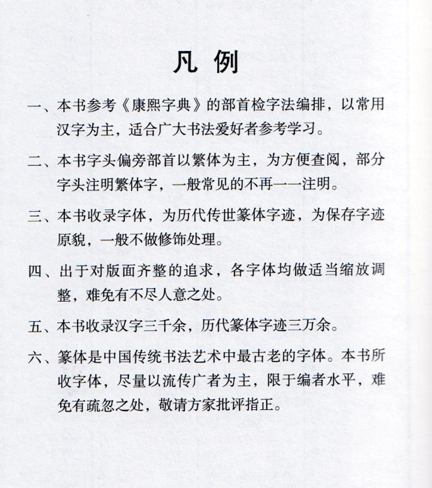 This dictionary is a reference work for lovers of Chinese calligraphy. Note: In order to be able to use the dictionary completely, prior knowledge is recommended in order to be able to search the characters with the dictionary (this is a purely Chinese dictionary without transcription Hanyu Pinyin and only with the radical method can be searched, the page numbers are not in Arabic numerals but also written in Chinese characters). In order to be able to use this dictionary, previous knowledge of recognizing and reading Chinese characters is necessary, and previous knowledge of searching with a radical index of a Chinese dictionary is recommended.