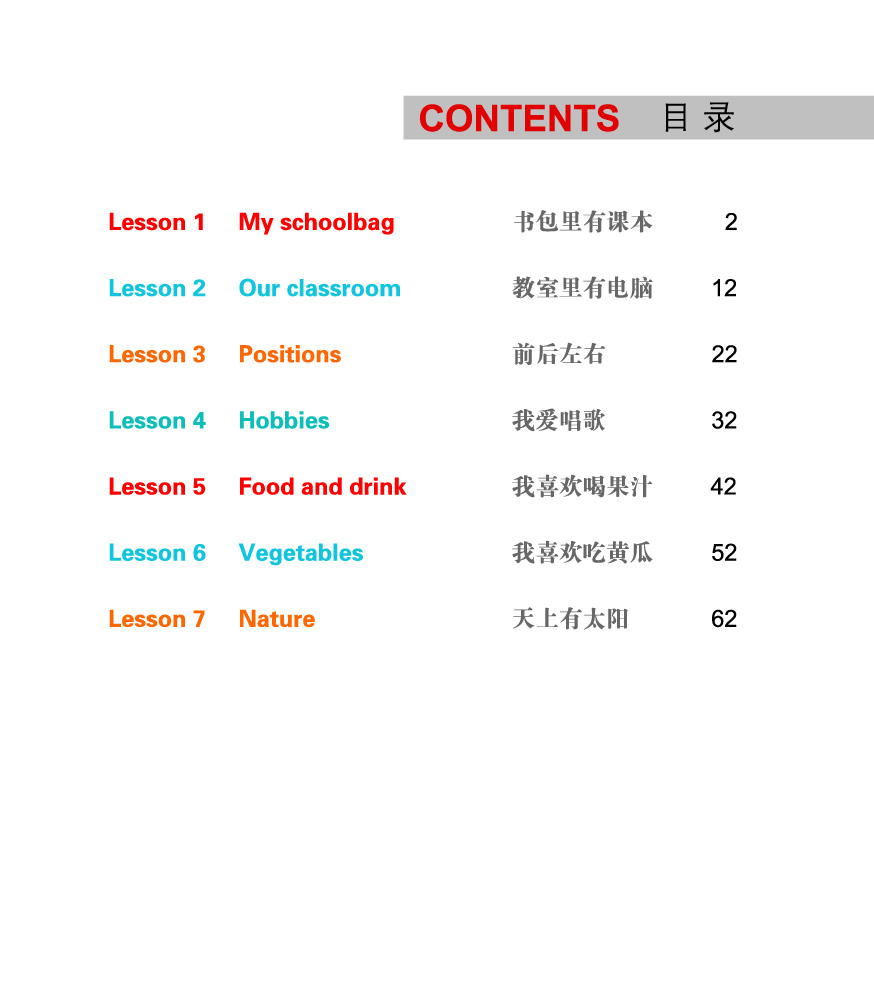 本套教材围绕丁一、田力、京京和乐乐4个中外小学生的故事展开,用精美的插图、简短的句子和对话、优美的歌曲等生动的形式培养起学生学习汉语的兴趣,使其轻松打好汉语学习的基础,掌握如数字、汉字基本笔画、家庭成员、日常用语等汉语知识,并且每册以精美的图片、简洁的文字和有趣的彩色贴纸等形式介绍一个中国文化小知识。