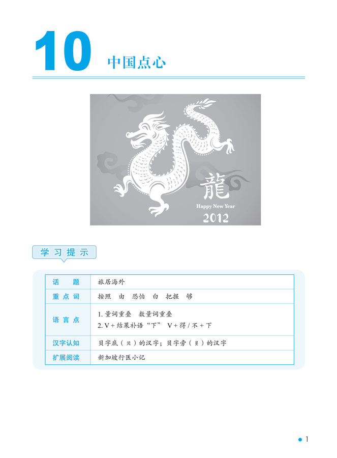全书共9课,每课由“学习提示、热身活动、课堂学习、实践活动、学习后记”等几大板块构成;3课为一个单元,每个单元有单元练习。全书配有课后练习活页,与教材配套,并附课文、生词录音MP3光盘以及单元测验和期中/期末总测试题。
