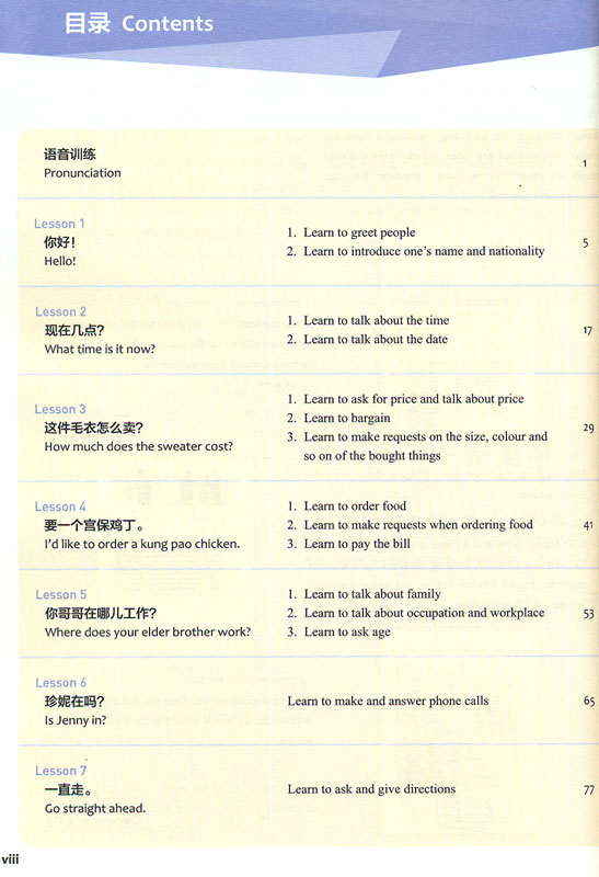 Studying in China is designed for short-term courses for Chinese beginners (40-70 hours). The book includes the pronunciation training (2-4 hours) and 12 regular lessons (3-4 hours for each lesson). This book contains a pronunciation training (2-4 class hours) and 16 regular lessons (3-4 class hours for each lesson), 5 self-check exercises and 2 Chinese songs. The regular lessons consist of the parts objectives, words and phrases, key sentences, look and say, scenes, activtites and write characters. Students will obtain about 230 words and phrases and 90 key sentences after finishing this book.