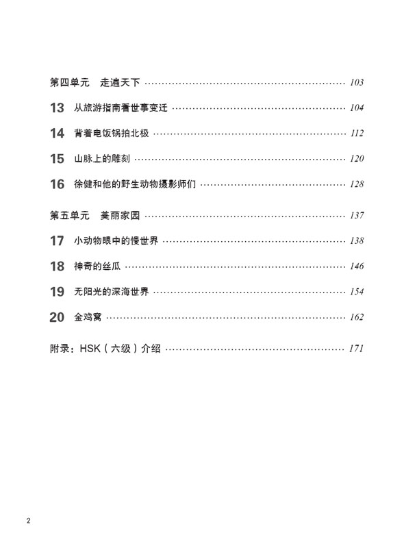 The whole series is divided into six levels matching the HSK test, with one volume for each of Levels 1-3 and two volumes for each of Levels 4-6, totaling nine volumes. With a textbook, a workbook and a teacher’s book in each volume, there are altogether 27 books.