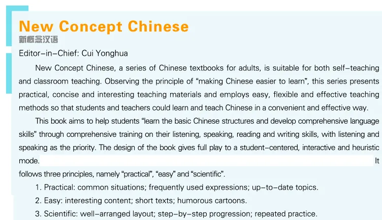 《新概念汉语》,借鉴了蜚声世界、有着广泛影响的英语教材《新概念英语》的编写理念,同时从汉语和汉语教学的特点出发,在总结长期教学实践经验的基础上,汲取了新世纪第二语言教学理论和教材理论研究的新成果。在继承听说法优势的基础上,有效结合交际法、任务法、以学生为中心等新的方法和理念,克服了单纯使用听说法教学的弊端。
