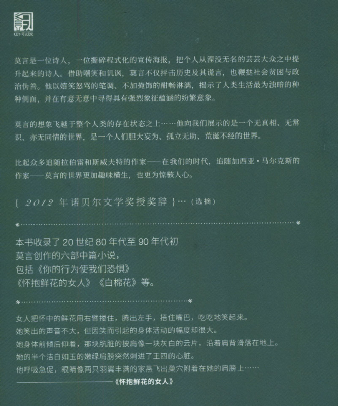 The Woman with Flowers (怀抱鲜花的女人) is novella collection with six novellas from the 1980s to the early 1990s by Mo Yan. Simplified Chinese edition. Mo Yan is China's first Nobel Prize of literature winner.
