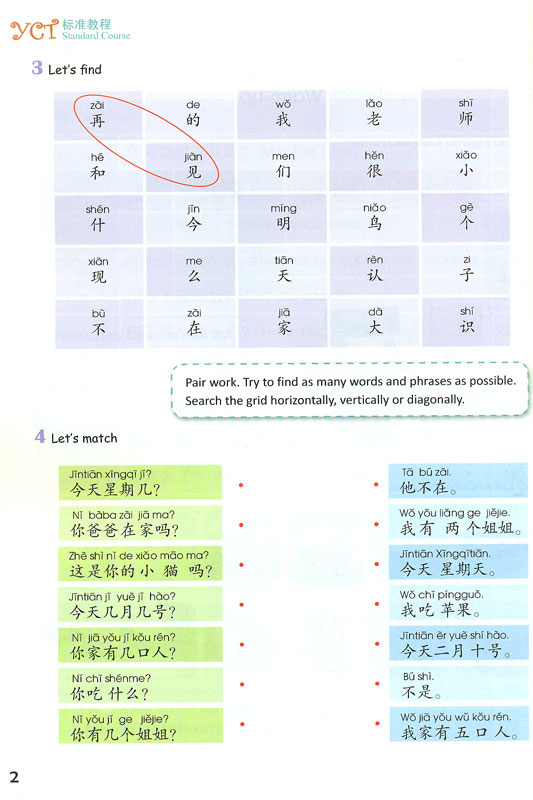 The Youth Chinese Test (YCT) is an international standardized test of Chinese proficiency, which evaluates the ability of primary school and middle school students whose mother tongue is not Chinese to use the Chinese language in their daily lives and study. YCT Standard Course has been developed based on the analysis of YCT papers and the principle of "combining testing and teaching".